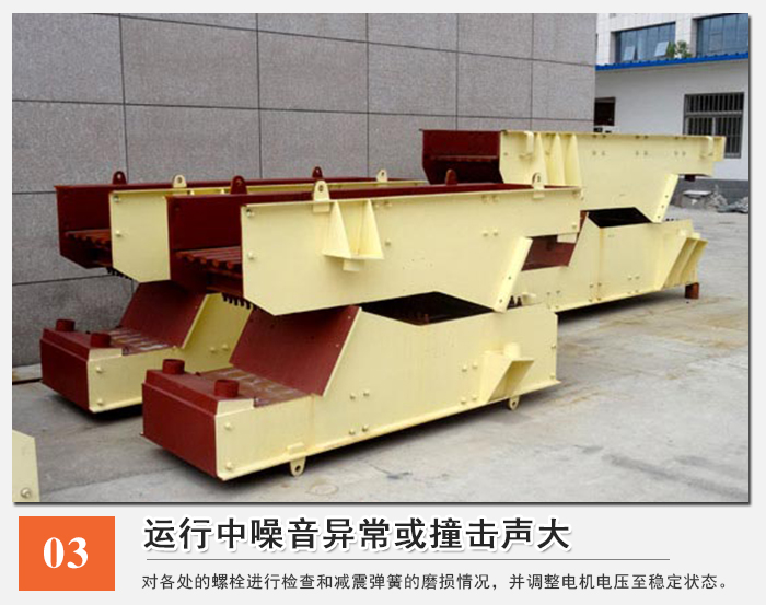1)地腳螺栓或激振器與槽體連接螺栓產(chǎn)生松動(dòng)或斷裂:對(duì)各處的螺栓進(jìn)行檢查,對(duì)其進(jìn)行更換或緊固作業(yè);